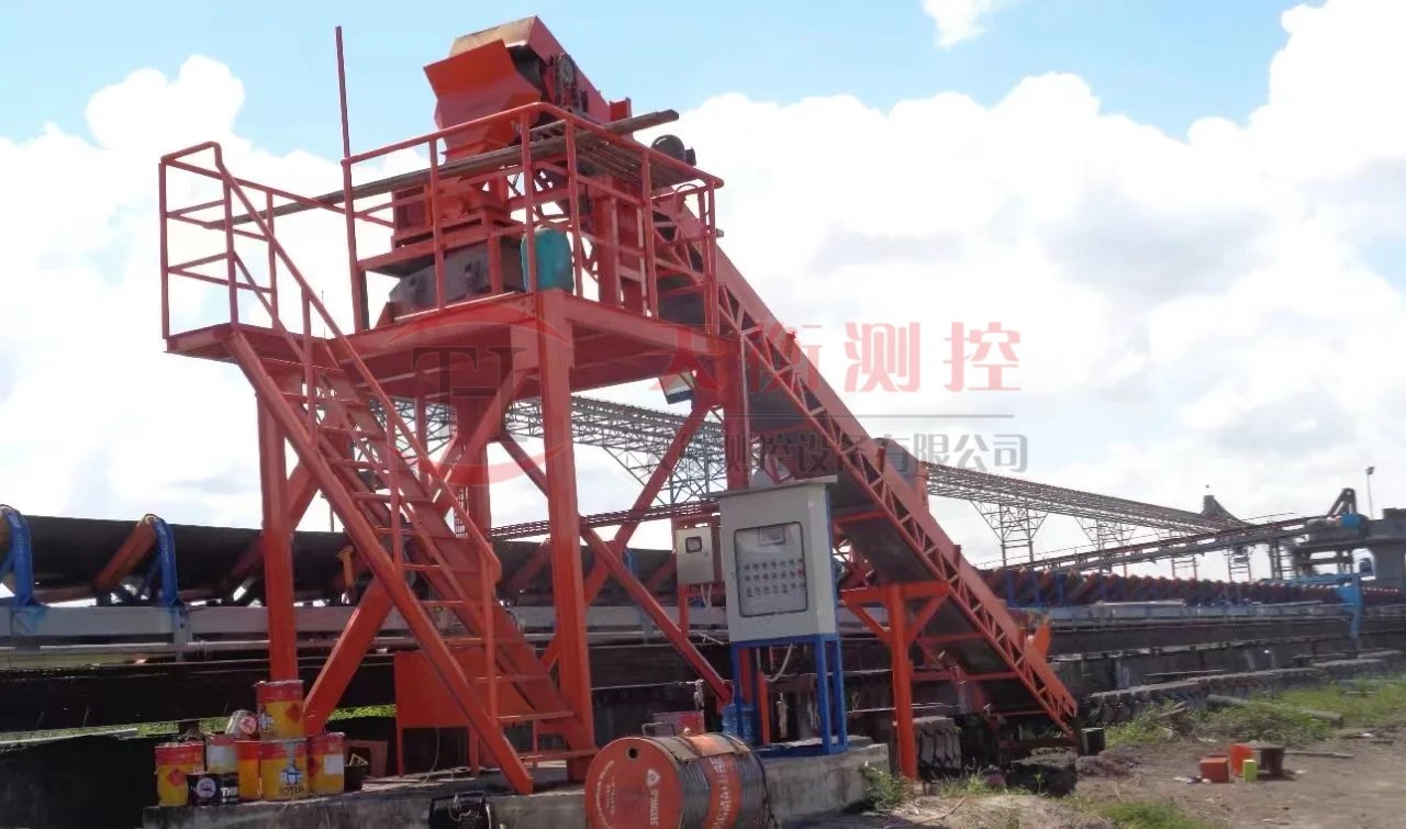 采樣裝置按設(shè)定的時(shí)間從皮帶上做全斷面刮掃,回轉(zhuǎn)運(yùn)動(dòng)式的皮帶頭旋轉(zhuǎn)運(yùn)動(dòng)由PLC控制的減速機(jī)構(gòu)完成。旋轉(zhuǎn)式采樣斗由減速齒輪傳動(dòng),皮帶機(jī)機(jī)頭部滾筒下料的以一定的轉(zhuǎn)速切割料流,物料流在物料流中流過(guò)全寬,全厚完整的子樣。采樣的字樣通過(guò)溜槽進(jìn)入初級(jí)送料皮帶機(jī),同時(shí)把樣品均勻送入破碎機(jī)破碎到一定的粒度,再通過(guò)次級(jí)皮帶及縮分器分成留樣和棄料,留樣被自動(dòng)收集在儲(chǔ)料罐中,棄料被斗式提升機(jī)返回到皮帶。當(dāng)采樣機(jī)器旋轉(zhuǎn)到一定角度時(shí),由轉(zhuǎn)鼓組、料斗、溜槽收集的原始樣品自動(dòng)進(jìn)入樣品收集器或下一級(jí)設(shè)備。采樣頭旋轉(zhuǎn)角度在一個(gè)行程結(jié)束點(diǎn),采樣周期結(jié)束;同時(shí)繼電器啟動(dòng)時(shí)間,直到下一個(gè)采樣周期,再次啟動(dòng)電機(jī),實(shí)時(shí)采樣,從而實(shí)現(xiàn)對(duì)每批物料的采樣數(shù)量控制和采樣的次數(shù)。采樣周期和采樣機(jī)的間隔由PLC系統(tǒng)控制并調(diào)整采樣間隔。